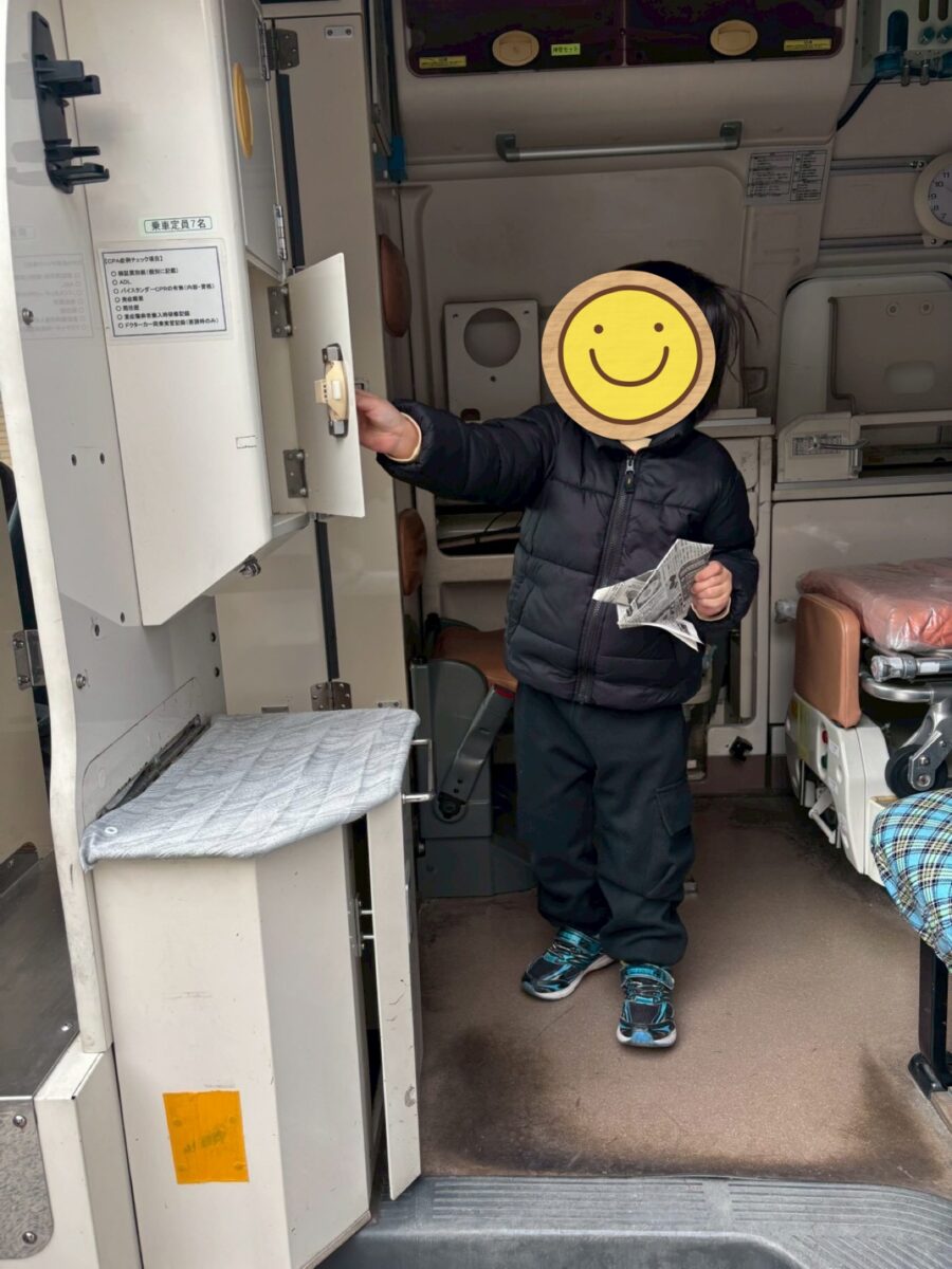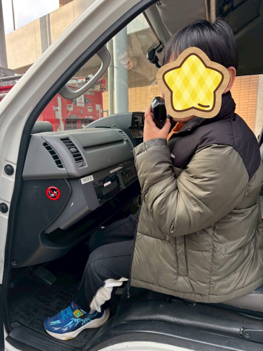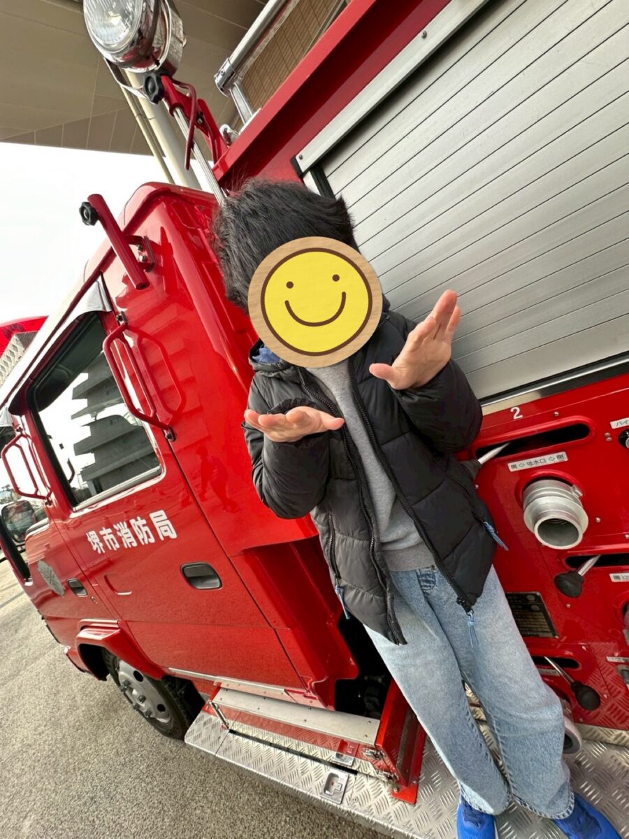 以前、大好評で子どもたちのリクエストもあり、堺市防災センターに行きました。防災センターに着いて、消防車が見えてくると、わくわくが止まらない様子でした!まず、職員の方からお話を聞いた後、地震体験をしました。次に練習の後、実際に真っ暗で煙(無害)のたち込める部屋を壁伝いに脱出する体験もしました。みんな説明をよく聞いて、真剣な顔つきで参加でき、職員の方から沢山褒めて頂きました。最後に消防車や救急車にも乗ることができ、運転席に座ってハンドルを回したり、救急車の中を見たり触ったり、、大満足の1日になりました!