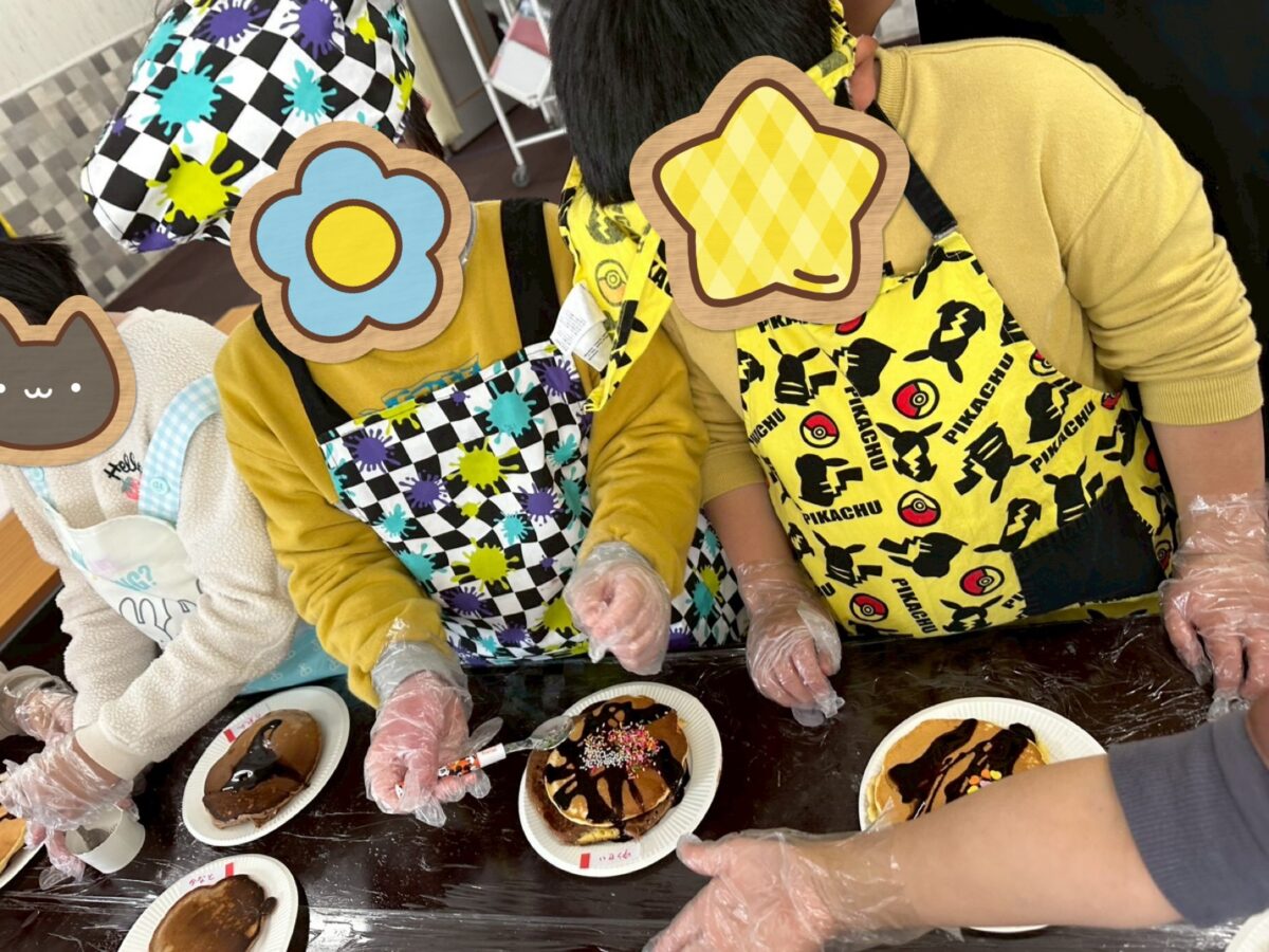 バレンタインはチョコレートという事で、ココアホットケーキを作りました。上からもチョコをたっぷりかけて、さらにチョコスプレーをかけてチョコまみれホットケーキを作りました!みんなとても美味しそうに食べていました!